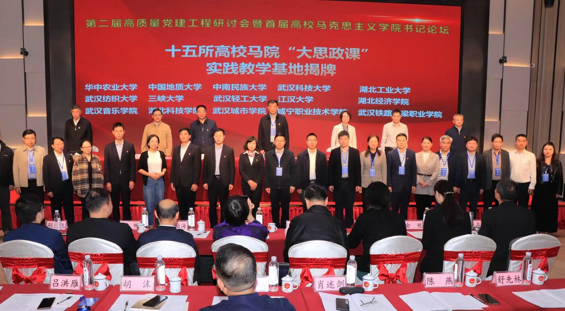 武科大网讯(通讯员郭海沙)10月14日,由永利官网主办的第二届高质量党建工程研讨会暨首届高校马克思主义学院书记论坛开幕式上,来自304am永利集团官网、华中农业大学、中国地质大学、中南民族大学、湖北工业大学、武汉纺织大学、三峡大学、武汉轻工大学、江汉大学、湖北经济学院、武汉音乐学院、湖北科技学院、武汉城市学院、咸宁职业技术学院、武汉铁路桥梁职业学院等15所高校马克思主义学院的党委书记或院长,集体向尧治河授予“大思政课”实践教学基地牌匾,标志着十五所高校“大思政课”实践教学基地在尧治河正式落户。