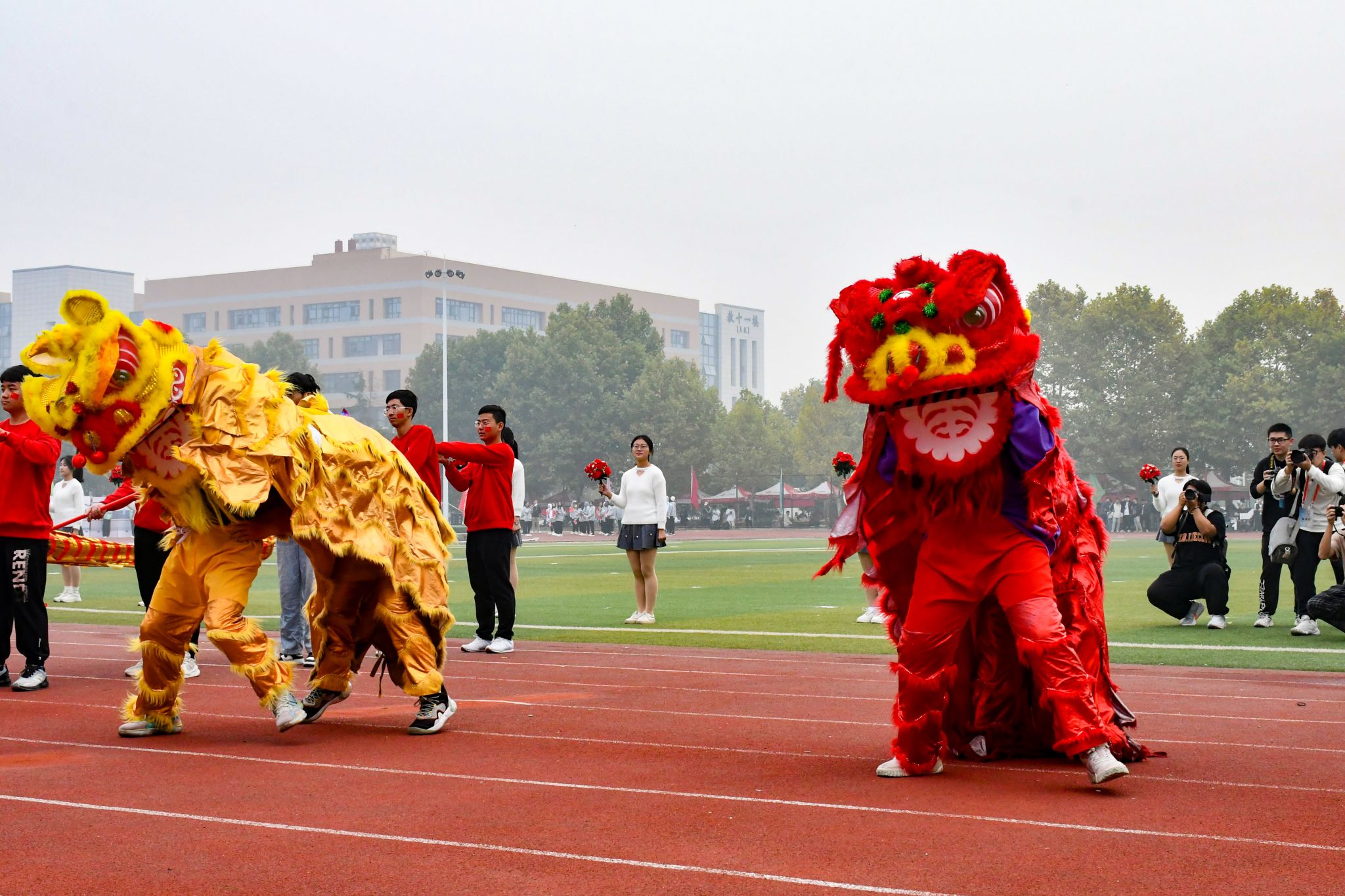 首先出场的材料学部舞龙队瞬间点燃全场,舞龙时而翱翔,时而俯冲,随着金光闪闪的舞龙的上下翻飞,四只活力四射的狮子也威风凛凛的加入了进来,伴随着铿锵有力鼓点追赶着绣球,观众欢呼鼓掌声不断。
