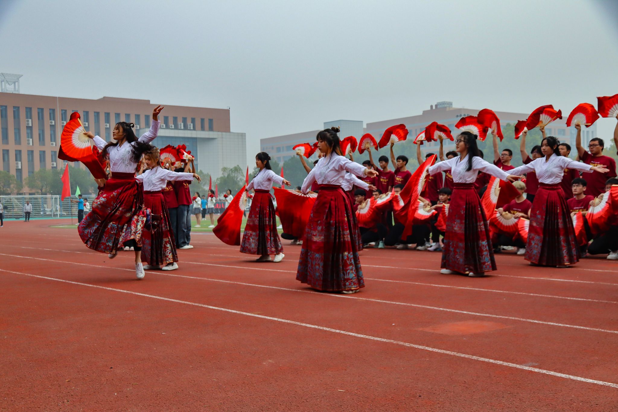 一曲《九州同》响起,法经学院方阵入场,方阵成员或身着汉服手提花灯,或着马面裙手舞红扇,伴随着国风音乐与中国鼓点,一排排学生依次开扇,随后变换队列,两侧女生高举红扇呈花朵形状,后排男生形成红扇海浪。方阵中央,身着红白色马面裙的女子们翩翩起舞,或展开双臂跳跃,或舞开红扇旋转。