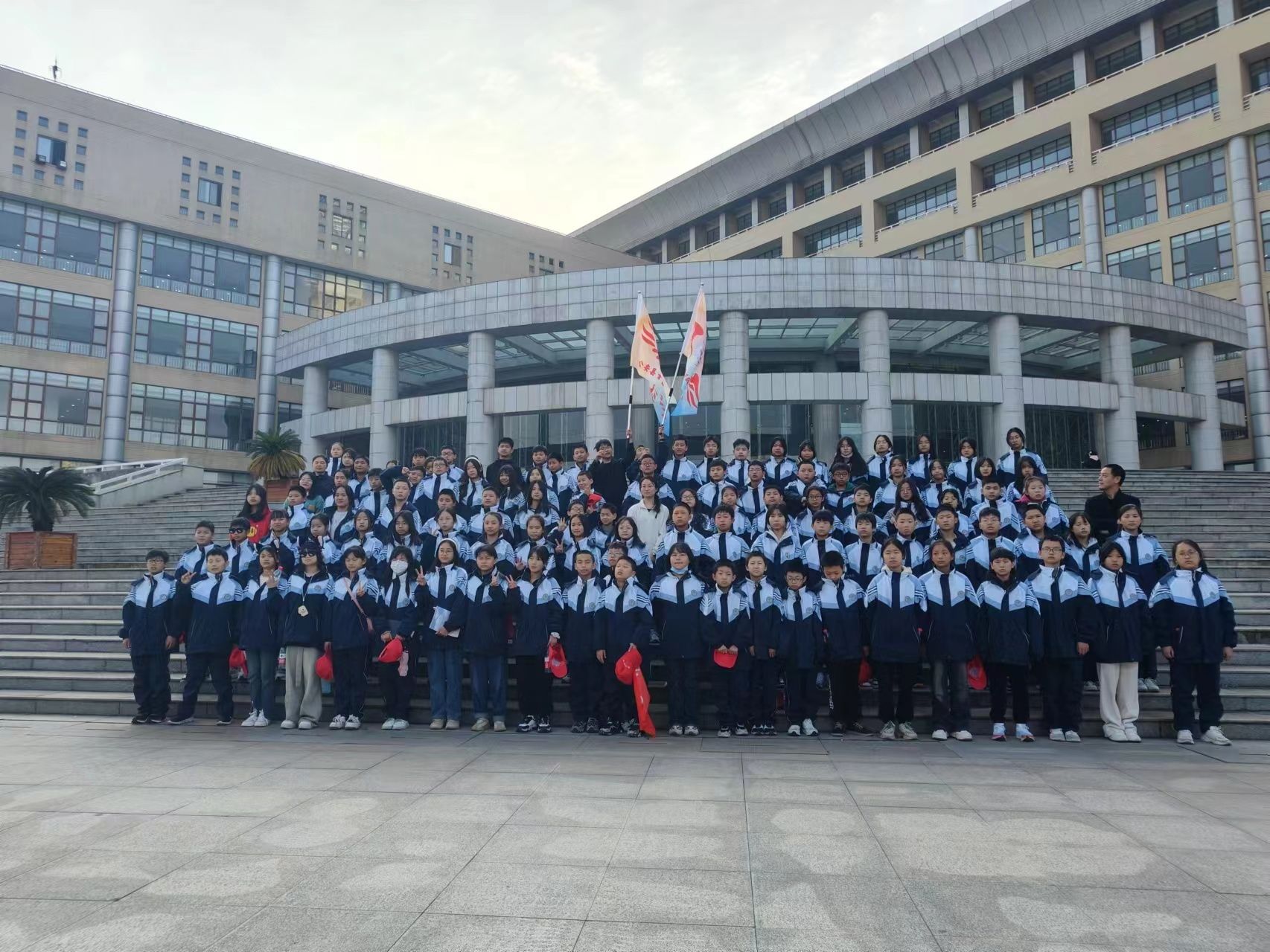 活动伊始,参与研学志愿活动的招生志愿服务中心成员在学校西门一同迎接章田寺初级中学师生的到来,众人一同在黄家湖校区图书馆前留下合影。