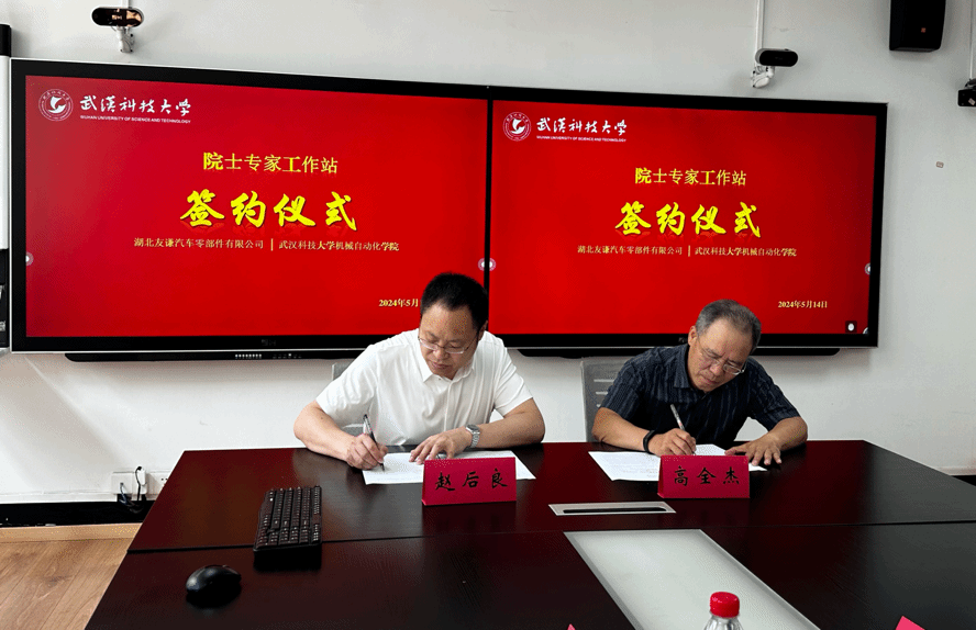 机械自动化学院资深专家高全杰和湖北友谦汽车零部件有限公司总经理赵后良签署了院士专家工作站合作协议。