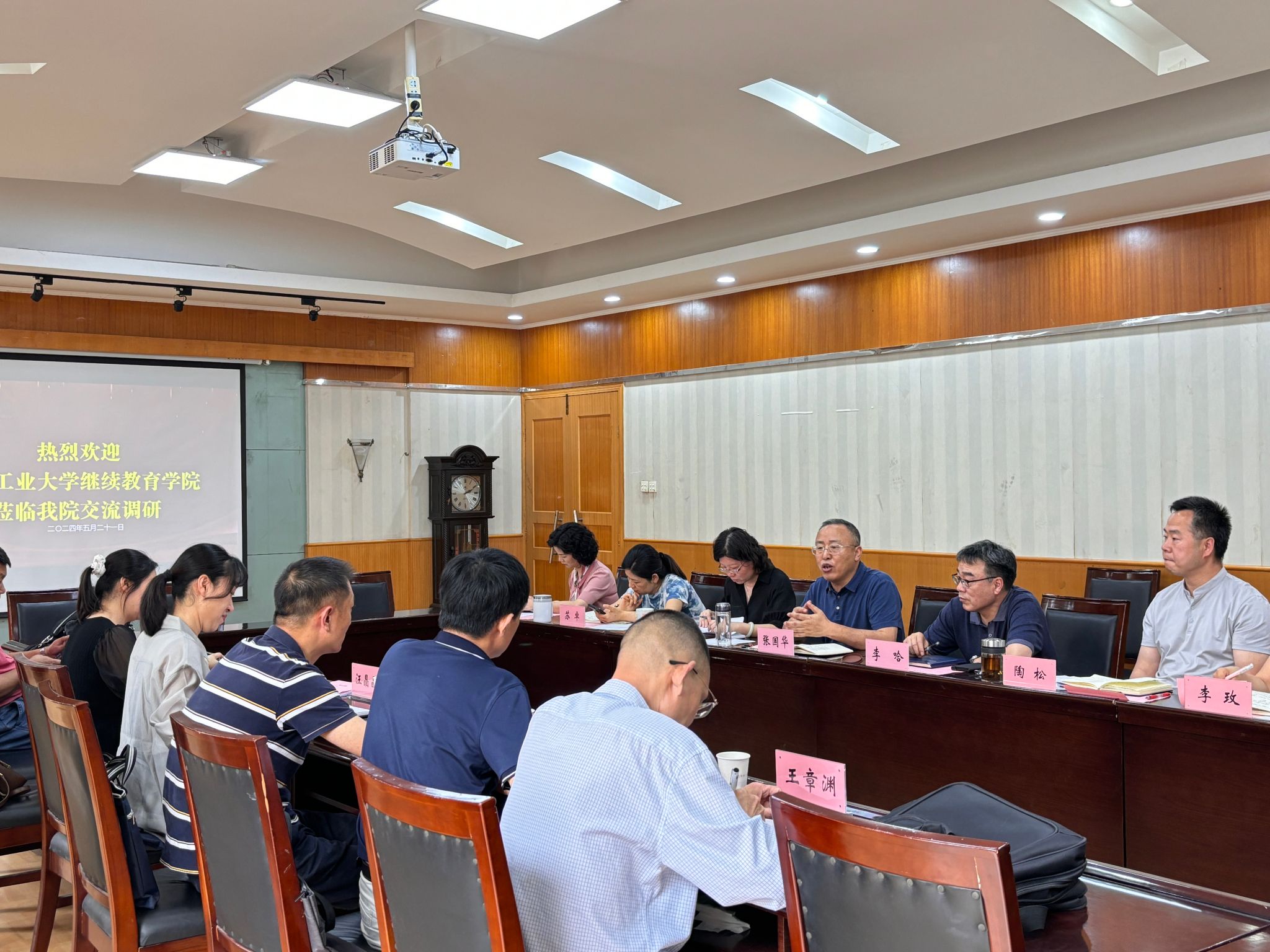 李哈代表学院对汪晶晶一行来访表示热烈欢迎。随后,张国华向来宾介绍了继续教育学院基本情况、业务工作和近年来改革发展情况。随后,陶松就成人教育有关工作做了重点介绍。