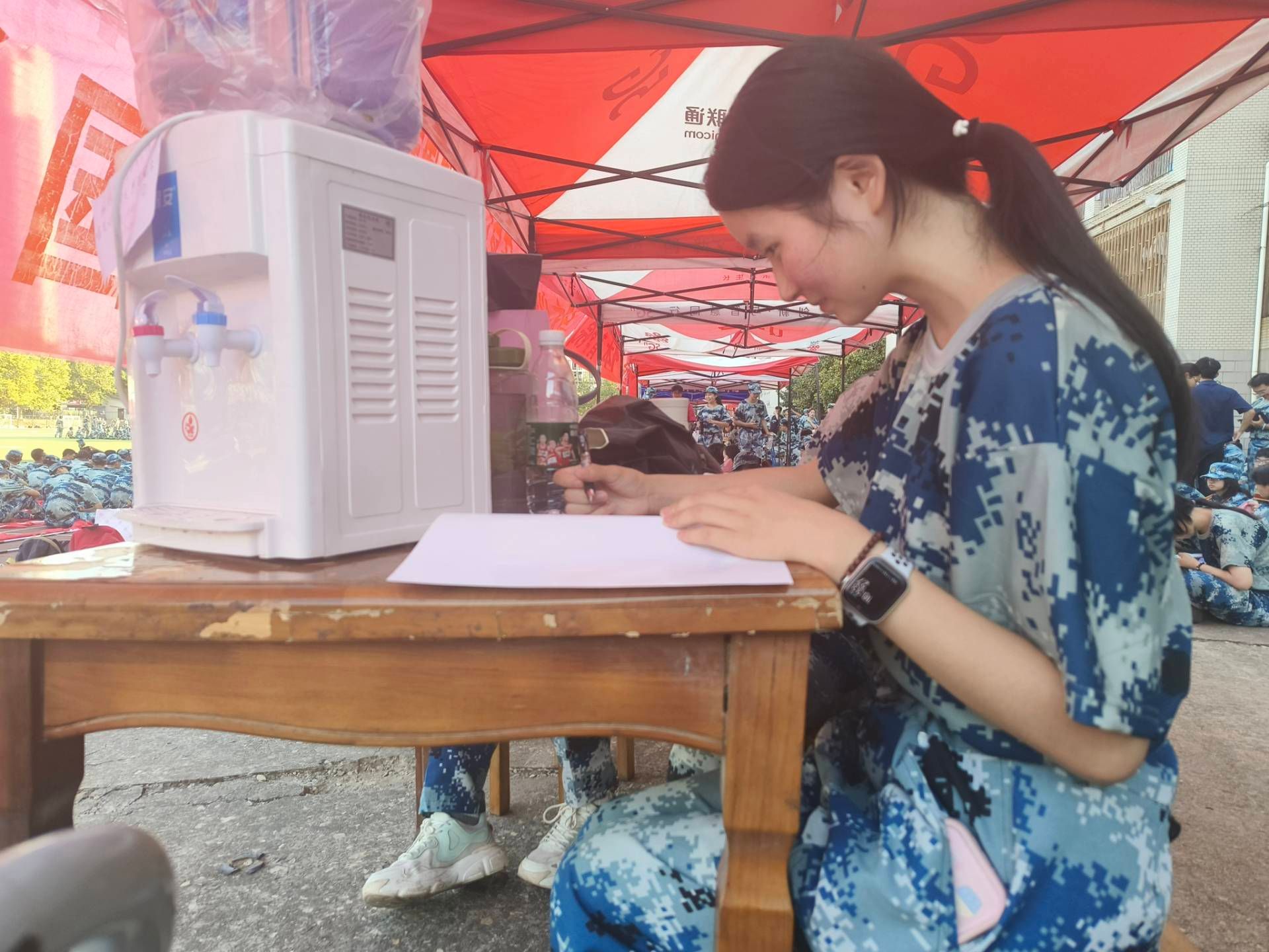 “因为她不能晒太阳,我就让她在帐篷里帮同学们接水、记录请假人数,做些后勤工作。”辅导员裴林茹说。在军训期间,她发现周文君每天都会在本子上记录,“她写了很厚一本,正好我们的军训快报也需要文案,我就想发挥她的特长。”据悉,军训快报是永利官网各学院收集新生军训感悟和照片的报刊,“我们学院用文君的原创散文诗作为快报文案,是独一无二的,印刷出来也很漂亮。”裴林茹看着手中的军训快报,笑着说。周文君起初十分担心自己会写不好,裴林茹常对她说“我相信你”,给了她很大的自信与支持。