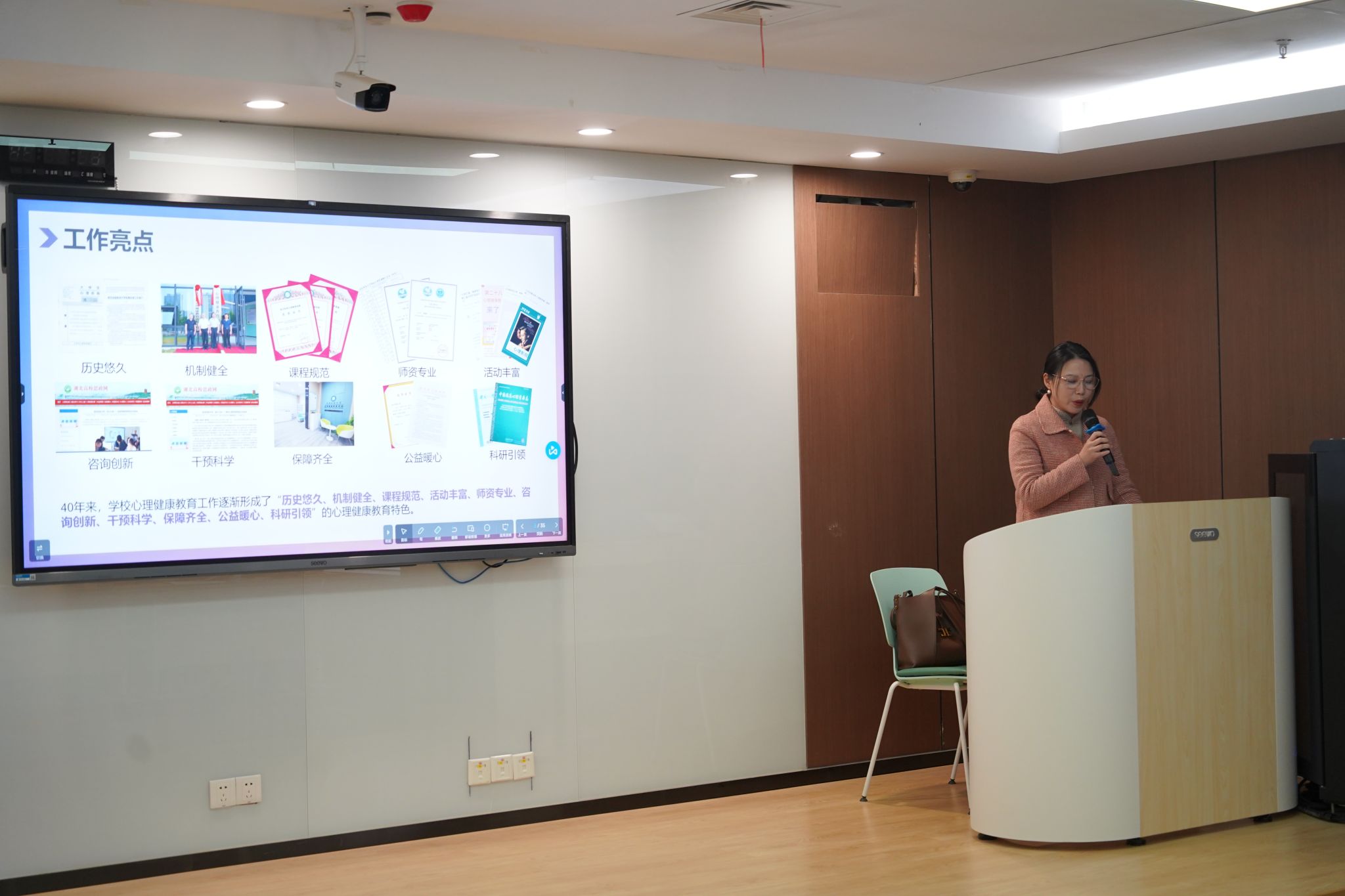 下午14点30分,龚晗讲授了《大学生心理健康教育工作体系的构建与实施》,介绍了永利官网心理健康中心的四十年历史沿革与机制建设。随后从课程建设、活动体系、咨询体系,干预体系以及科研引领等方面展示出永利官网学心理工作的前沿性与完善性。