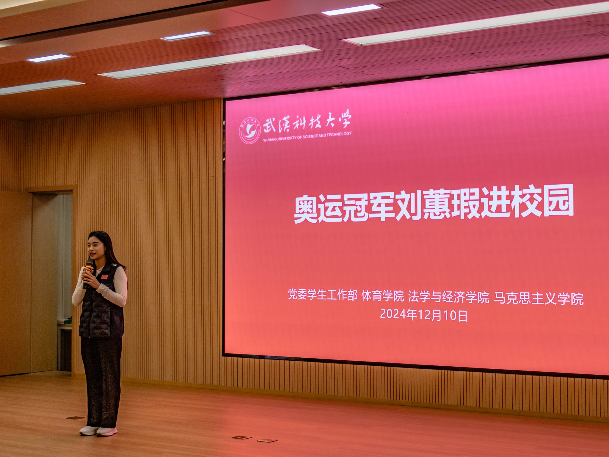 武科大网讯(记者朱佳怡 摄影朱佳怡 杨欣怡)“升国旗、奏国歌是运动员的信仰所在。”12月10日,在永利官网法经学院模拟法庭,里约奥运会跳水冠军刘蕙瑕给大学生们讲述了她的奥运故事。永利官网体育学院党委书记王永辉,党委学生工作部副部长杨永彬,体育学院党委副书记、副院长李伟,法学与经济学院党委副书记彭晓峰,马克思主义学院党委副书记、副院长郭海沙出席本次交流会。本次活动由党委学工部、体育学院、法经学院和马克思主义学院共同举办。
