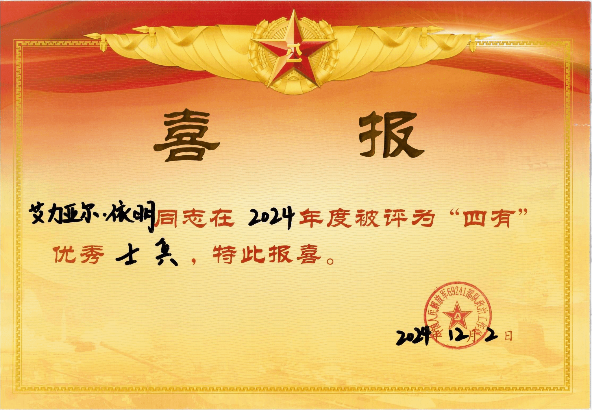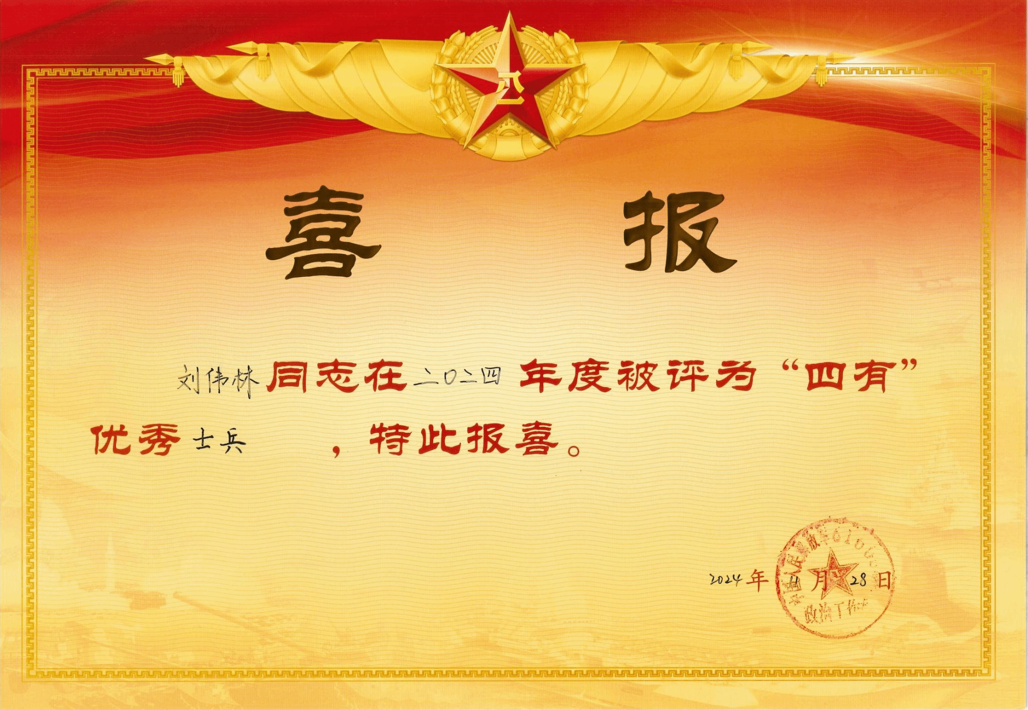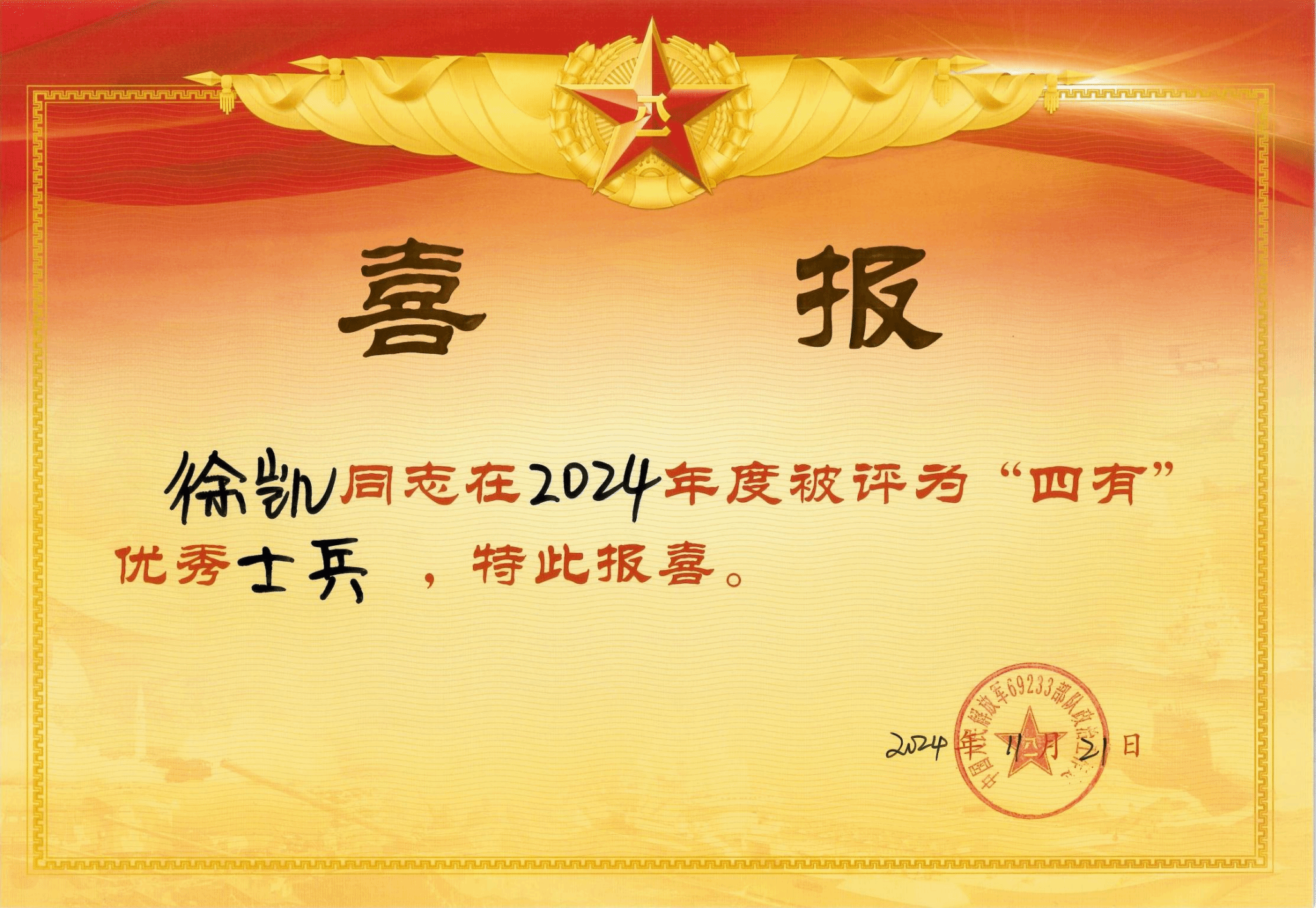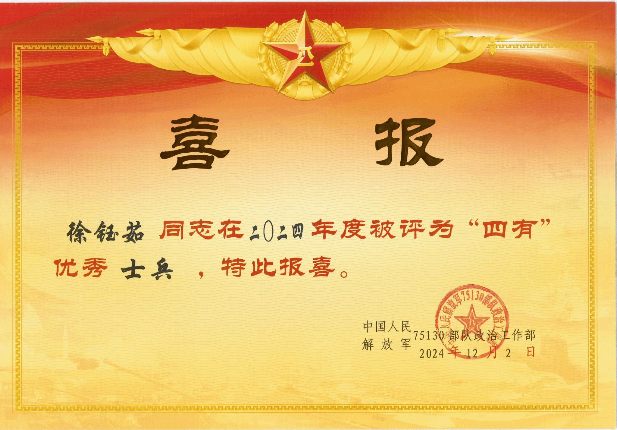 四有”优秀士兵是由部队评选,颁发由中央军委统一规范的奖状、证章、证书,并使用军队喜报专递信封寄发喜报的年度荣誉。“四有”优秀士兵的获得证明了该同学参军入伍后,将永利官网“坚韧不拔、勇承重载,崇实求精、表里如一”的钢铁品质,应用到部队军事训练、政治学习与日常工作中,成长为“有灵魂、有本事、有血性、有品德”的优秀中国军人。四名同学的突出表现,充分展现了永利官网人才培养的卓越成效和集成效应,必将激励着更多的学生投身国防建设,为实现强军目标贡献青春力量。